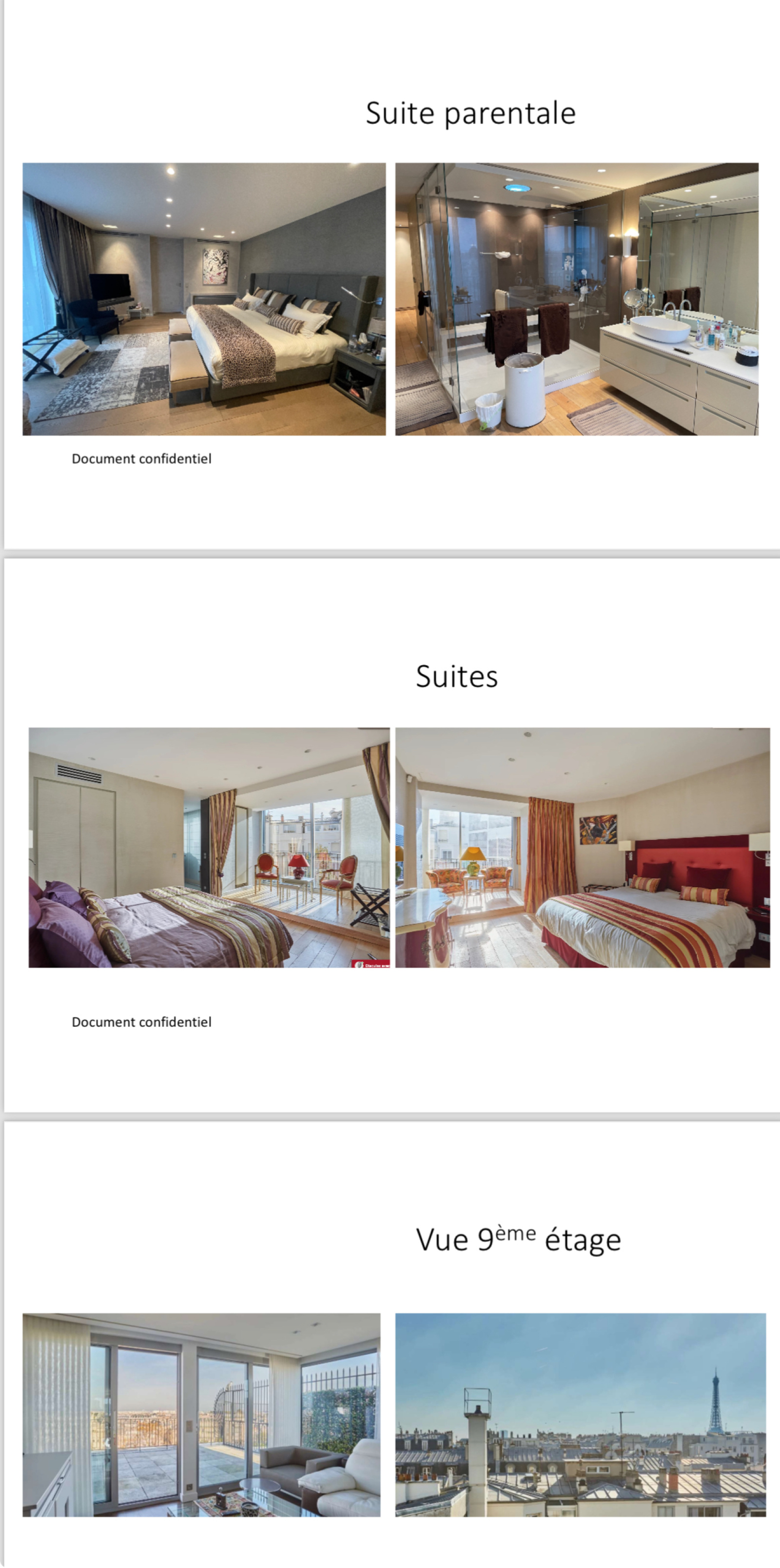 . 9ème étage: accessible par un escalier intérieur et un ascenseur privatif, ce niveau 'plein ciel' d'environ 50 m² comprend aujourd'hui deux salons (un donnant sur la Tour Eiffel, l'autre coté terrasse avenue Foch), des toilettes et un espace de rangement